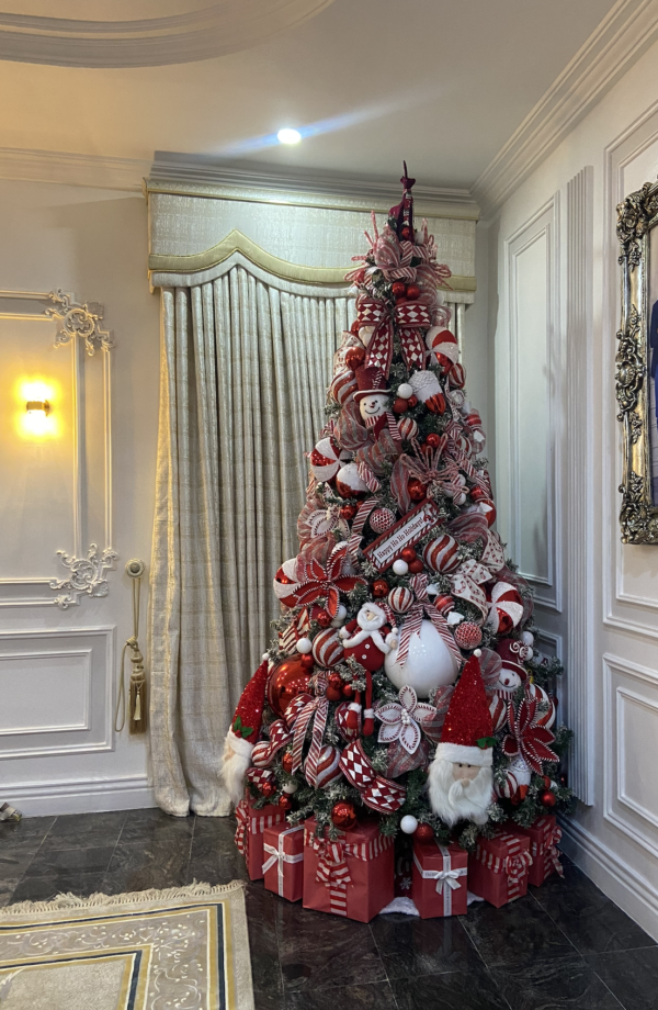 The pairing of pure white and bold red ornaments creates a timeless festive contrast. White evokes calm, elegance, and winter beauty, while red brings warmth, joy, and celebration—together forming a harmonious and captivating display.