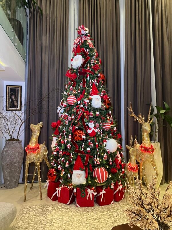 This traditional green tree, enhanced with red and white accents, offers a design that is both iconic and elevated. It’s ideal for those who appreciate timeless Christmas styling with a polished, modern edge.